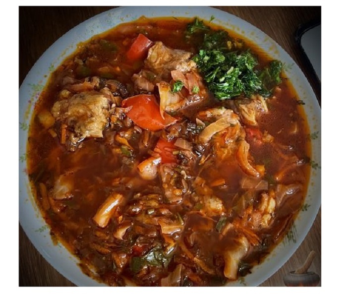 Состав: Говядина на кости, сало, свёкла, капуста белокочанная, морковь, перец болгарский, лук репчатый, лавровый лист, томатная паста, уксус яблочный, масло растительное, соль, вода, прованские травы, сметана для подачи